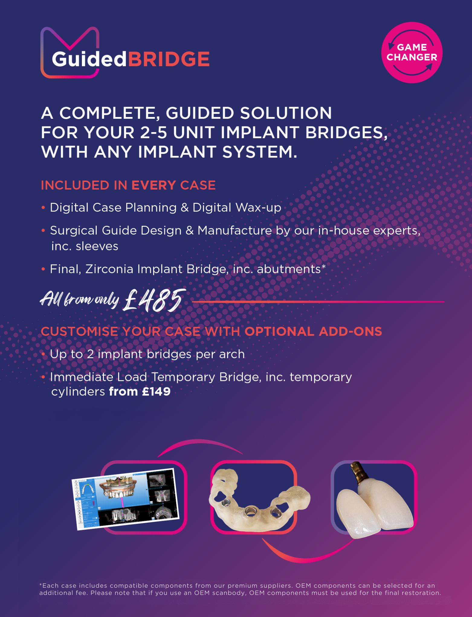 Welcome to Guided Bridge, the latest, innovative guided solution from Quoris3D. We're dedicated to simplifying digital workflows and providing transparent, fixed pricing, and Guided Bridge is no exception. Guided Bridge combines the latest advancements in restoratively led digital planning, guided surgery, digital impressions, digital restorative design, and cutting-edge Zirconia materials. It offers dentists the ultimate solution for planning, placing, and restoring dental bridges with ease and precision. Guided Bridge is compatible with all implant systems, making it a versatile option to enhance your workflow and improve treatment outcomes.